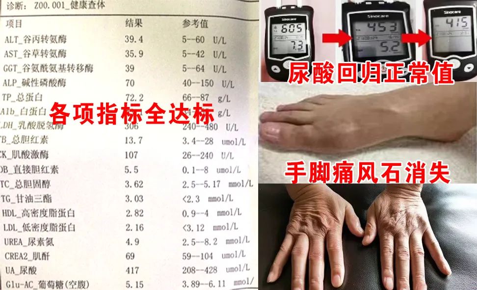 抱着半信半疑的心态,王大哥开始按方案调理。没想到效果来得这么快:调理第3天,尿量明显增加,尿里还排出了不少白色小颗粒(尿酸结晶),去医院查尿酸,居然降到了420以下,关节的肿胀感也消失了,那晚他终于睡了个安稳觉!